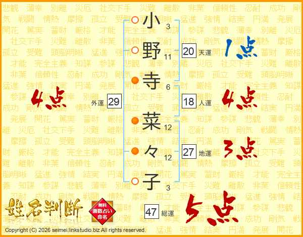 小(3画)野(11画)寺(6画) 菜(12画)々(12画)子(3画)