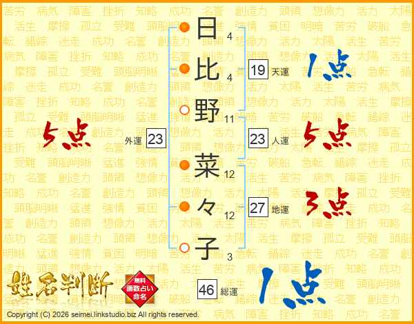 日(4画)比(4画)野(11画) 菜(12画)々(12画)子(3画)