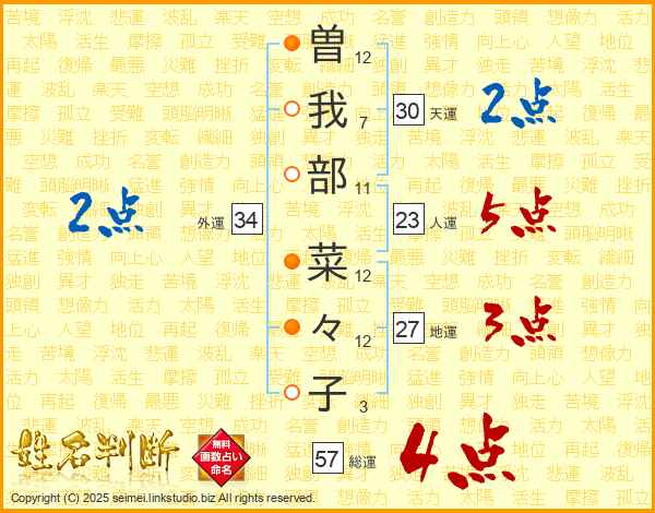 曽(12画)我(7画)部(11画) 菜(12画)々(12画)子(3画)