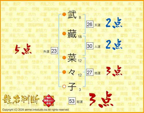 武(8画)藏(18画) 菜(12画)々(12画)子(3画)