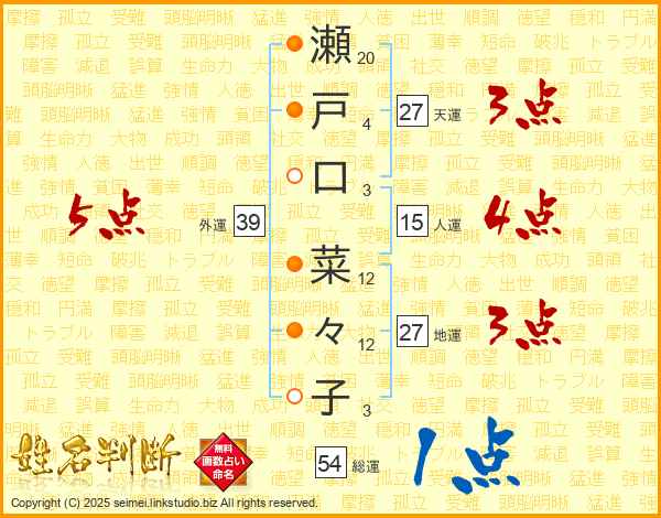 瀬(20画)戸(4画)口(3画) 菜(12画)々(12画)子(3画)