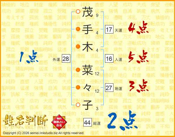 茂(9画)手(4画)木(4画) 菜(12画)々(12画)子(3画)