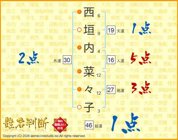西(6画)垣(9画)内(4画) 菜(12画)々(12画)子(3画)