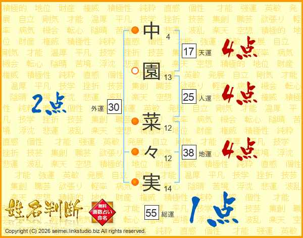 中(4画)園(13画) 菜(12画)々(12画)実(14画)