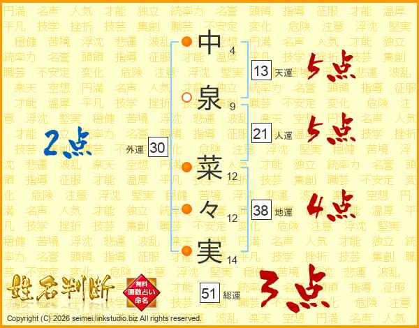 中(4画)泉(9画) 菜(12画)々(12画)実(14画)