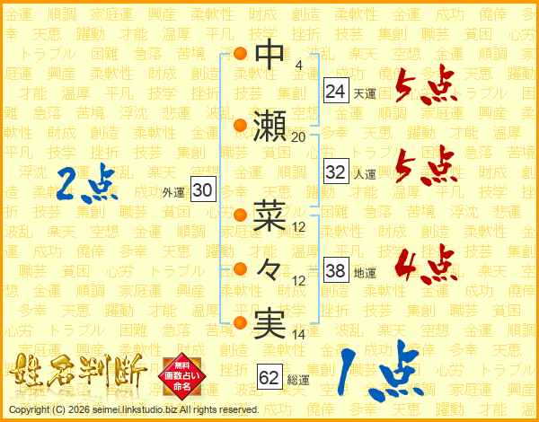 中(4画)瀬(20画) 菜(12画)々(12画)実(14画)