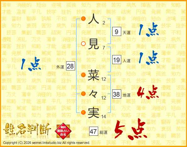 人(2画)見(7画) 菜(12画)々(12画)実(14画)