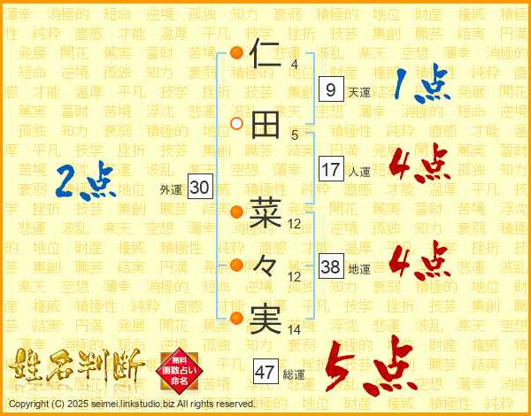 仁(4画)田(5画) 菜(12画)々(12画)実(14画)