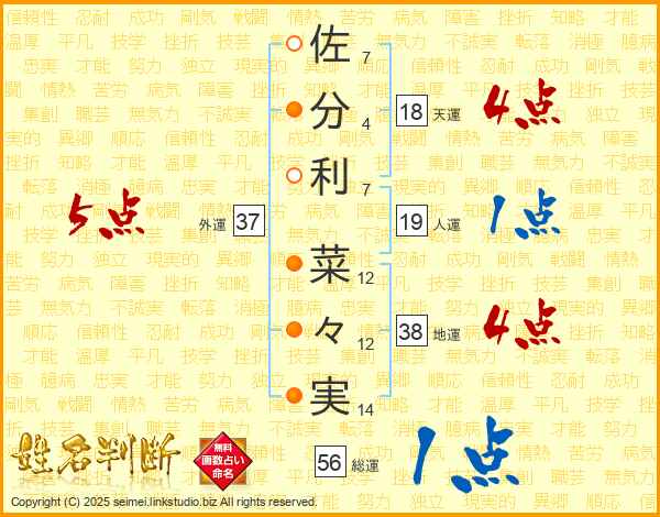 佐(7画)分(4画)利(7画) 菜(12画)々(12画)実(14画)