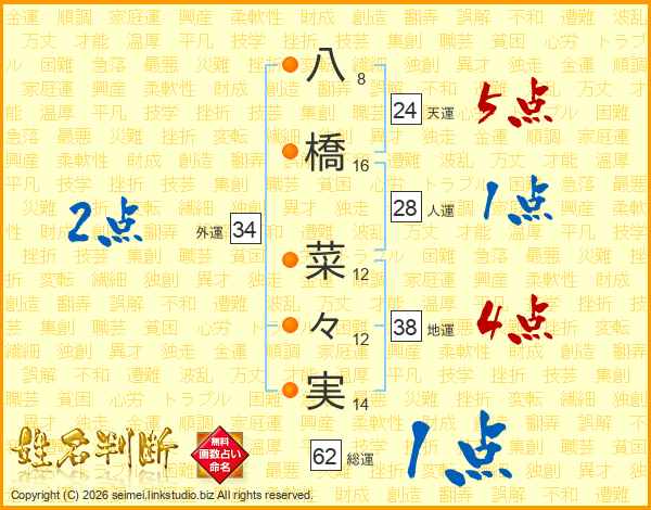 八(8画)橋(16画) 菜(12画)々(12画)実(14画)