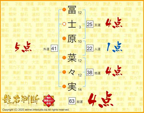 冨(12画)士(3画)原(10画) 菜(12画)々(12画)実(14画)