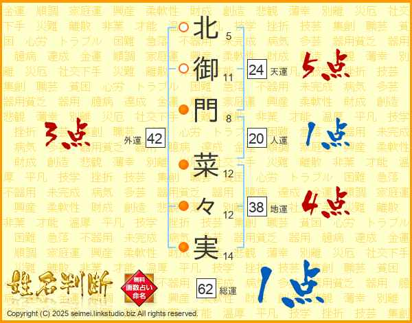 北(5画)御(11画)門(8画) 菜(12画)々(12画)実(14画)