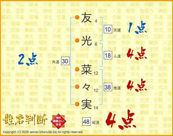 友(4画)光(6画) 菜(12画)々(12画)実(14画)