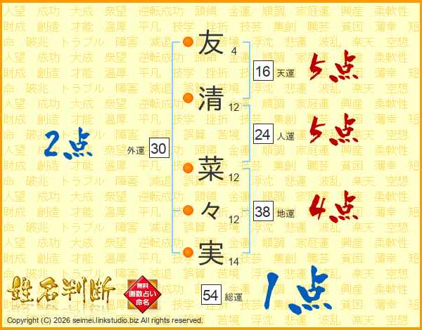 友(4画)清(12画) 菜(12画)々(12画)実(14画)