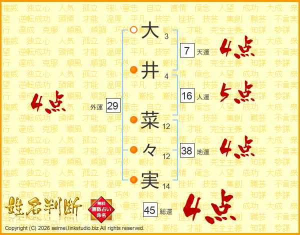 大(3画)井(4画) 菜(12画)々(12画)実(14画)