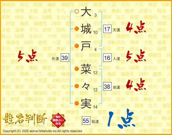 大(3画)城(10画)戸(4画) 菜(12画)々(12画)実(14画)