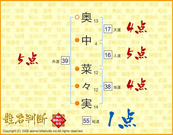 奥(13画)中(4画) 菜(12画)々(12画)実(14画)