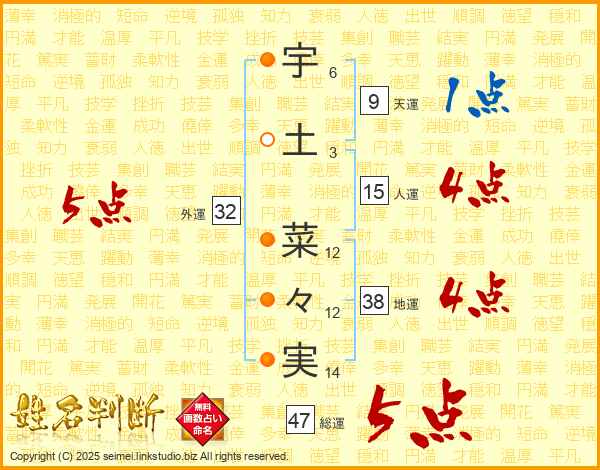 宇(6画)土(3画) 菜(12画)々(12画)実(14画)