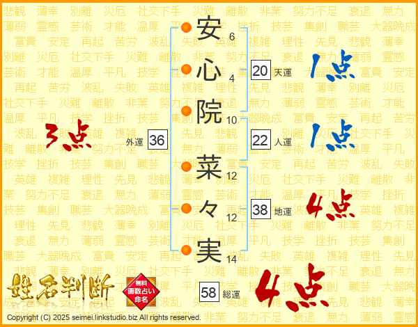 安(6画)心(4画)院(10画) 菜(12画)々(12画)実(14画)