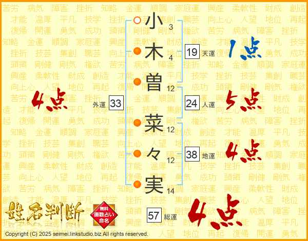 小(3画)木(4画)曽(12画) 菜(12画)々(12画)実(14画)