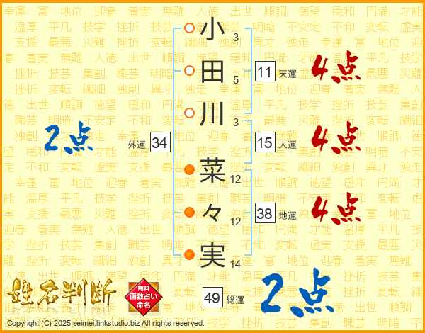 小(3画)田(5画)川(3画) 菜(12画)々(12画)実(14画)