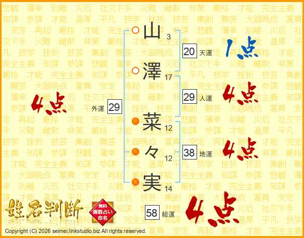 山(3画)澤(17画) 菜(12画)々(12画)実(14画)