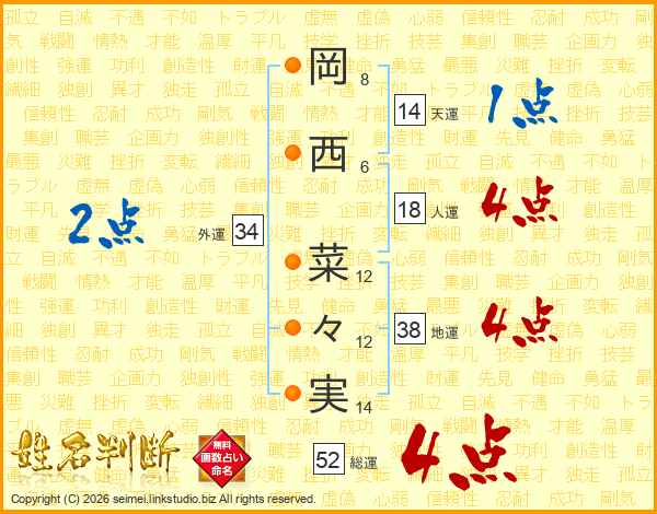 岡(8画)西(6画) 菜(12画)々(12画)実(14画)