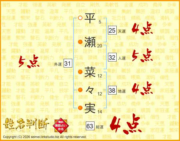 平(5画)瀬(20画) 菜(12画)々(12画)実(14画)