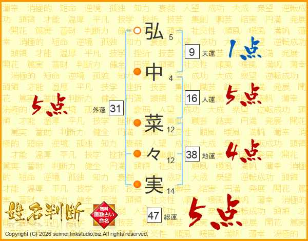 弘(5画)中(4画) 菜(12画)々(12画)実(14画)