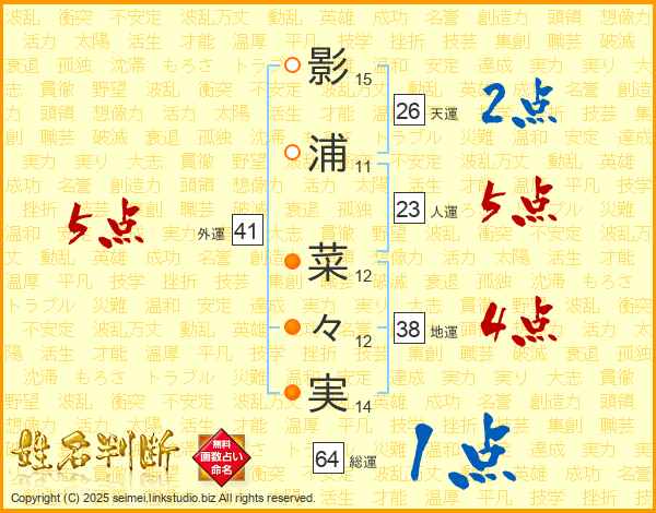 影(15画)浦(11画) 菜(12画)々(12画)実(14画)