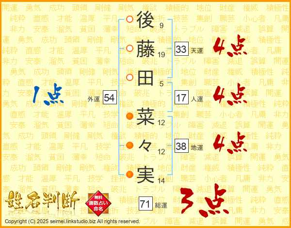 後(9画)藤(19画)田(5画) 菜(12画)々(12画)実(14画)