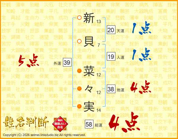 新(13画)貝(7画) 菜(12画)々(12画)実(14画)