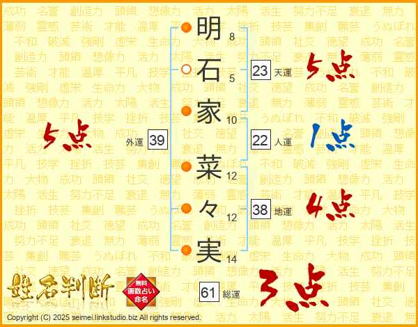 明(8画)石(5画)家(10画) 菜(12画)々(12画)実(14画)