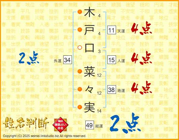 木(4画)戸(4画)口(3画)  菜(12画)々(12画)実(14画)