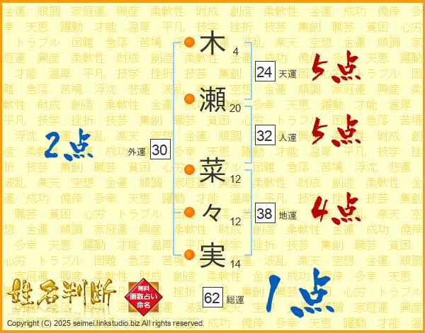 木(4画)瀬(20画) 菜(12画)々(12画)実(14画)