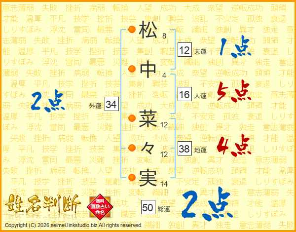 松(8画)中(4画) 菜(12画)々(12画)実(14画)