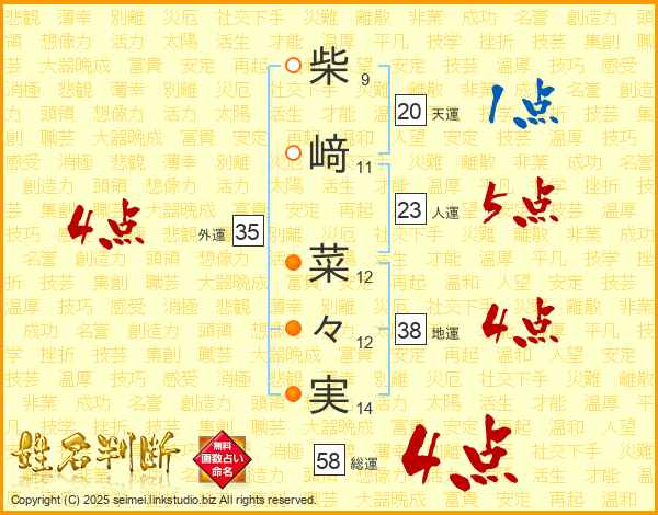 柴(9画)﨑(11画) 菜(12画)々(12画)実(14画)