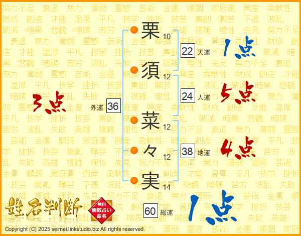 栗(10画)須(12画) 菜(12画)々(12画)実(14画)