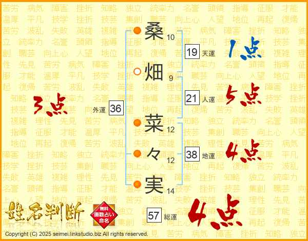 生活面を象徴する運勢です。外部から受ける影響力を表し、結婚運、家庭運や職場、環境への順応性を表します。総運から人運を引いた画数。姓や名が1文字の場合を除く。