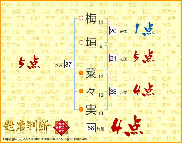 梅(11画)垣(9画) 菜(12画)々(12画)実(14画)