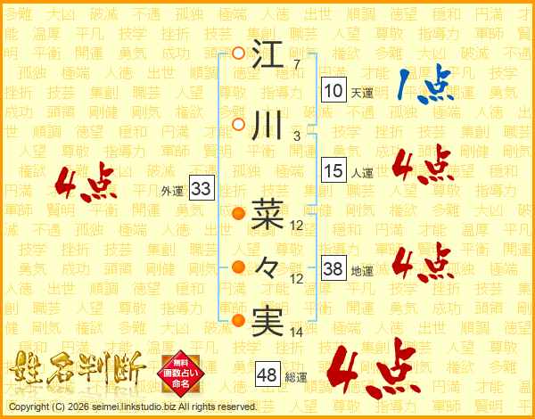 江(7画)川(3画) 菜(12画)々(12画)実(14画)