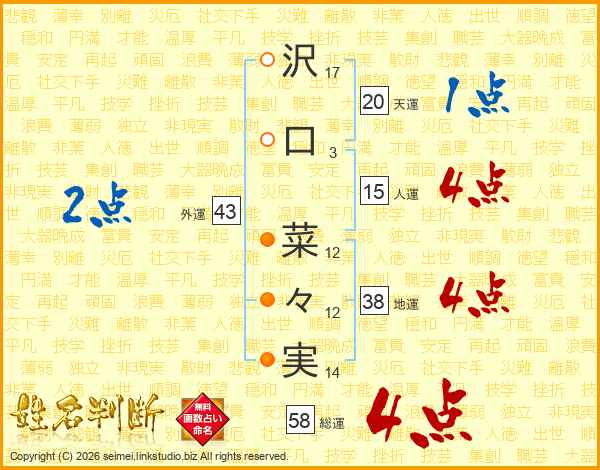 沢(17画)口(3画) 菜(12画)々(12画)実(14画)