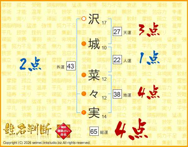 沢(17画)城(10画) 菜(12画)々(12画)実(14画)