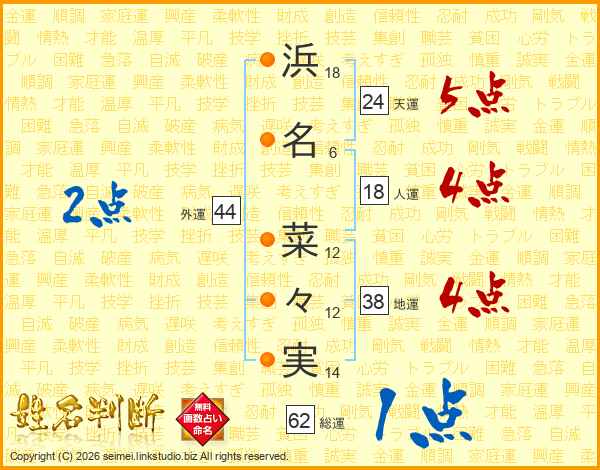 浜(18画)名(6画) 菜(12画)々(12画)実(14画)