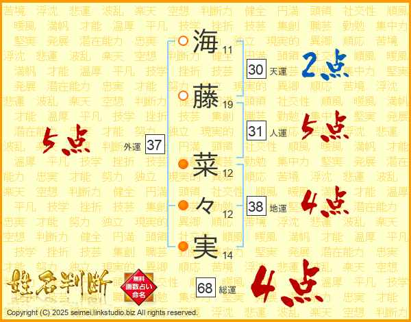 海(11画)藤(19画) 菜(12画)々(12画)実(14画)