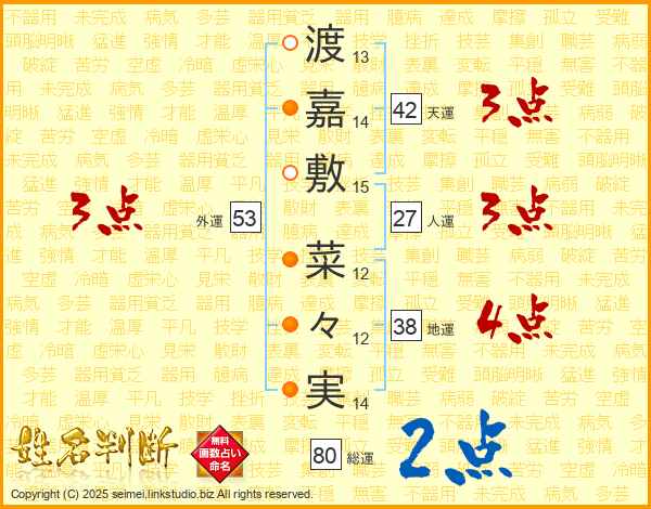 渡(13画)嘉(14画)敷(15画)  菜(12画)々(12画)実(14画)