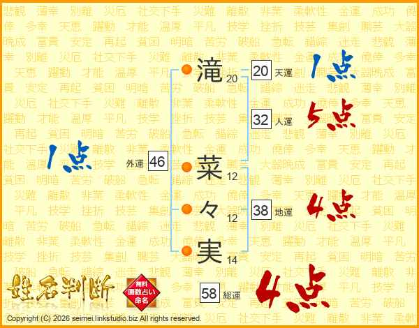 滝(20画) 菜(12画)々(12画)実(14画)