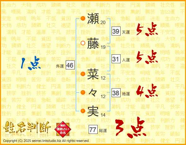 瀬(20画)藤(19画) 菜(12画)々(12画)実(14画)