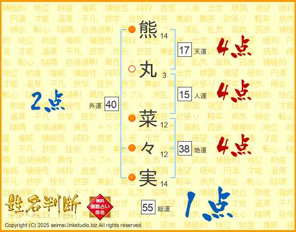 熊(14画)丸(3画) 菜(12画)々(12画)実(14画)