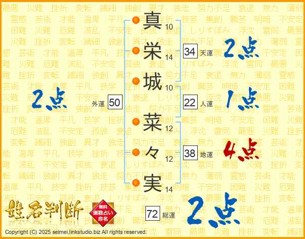 真(10画)栄(14画)城(10画) 菜(12画)々(12画)実(14画)